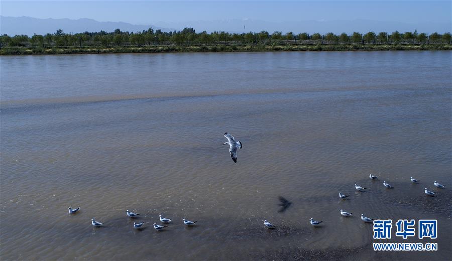 9月7日,一群鸟儿在高台县黑河湿地栖息(无人机拍摄)。 新华社记者陶明摄