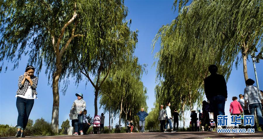 9月7日,高台县城的居民在黑河湿地护岸堤上休闲。 新华社记者陶明摄