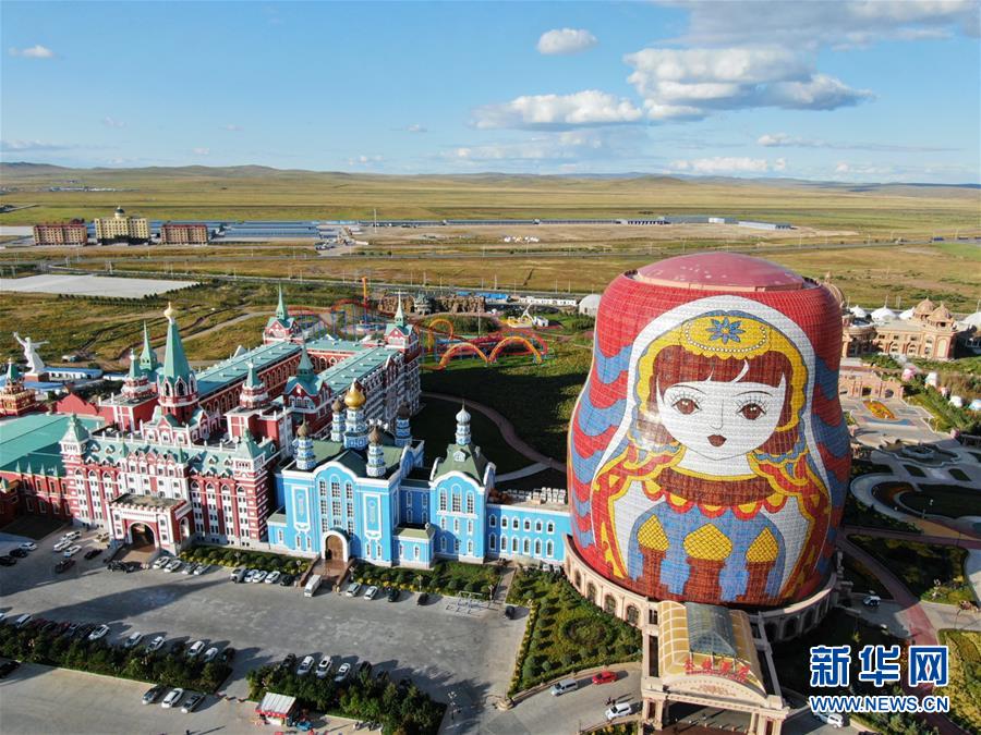 满洲里套娃广场 (9月7日无人机拍摄)。内蒙古自治区满洲里市位于中俄边境地区,改革开放以来,凭借独特地缘优势,已发展成为中国最大的陆运口岸城市。2017年,中俄双边贸易额超过840亿美元,同比增长20.8%,满洲里口岸承担着中俄贸易60%以上的陆路运输业务。经济的发展改善了满洲里的城市面貌和人居环境,为这座边境城市增添了魅力。新华社记者 邹予 摄