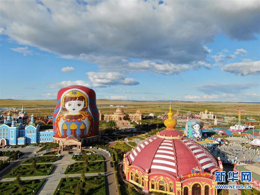 满洲里套娃广场 (9月7日无人机拍摄)。内蒙古自治区满洲里市位于中俄边境地区,改革开放以来,凭借独特地缘优势,已发展成为中国最大的陆运口岸城市。2017年,中俄双边贸易额超过840亿美元,同比增长20.8%,满洲里口岸承担着中俄贸易60%以上的陆路运输业务。经济的发展改善了满洲里的城市面貌和人居环境,为这座边境城市增添了魅力。新华社记者 邹予 摄
