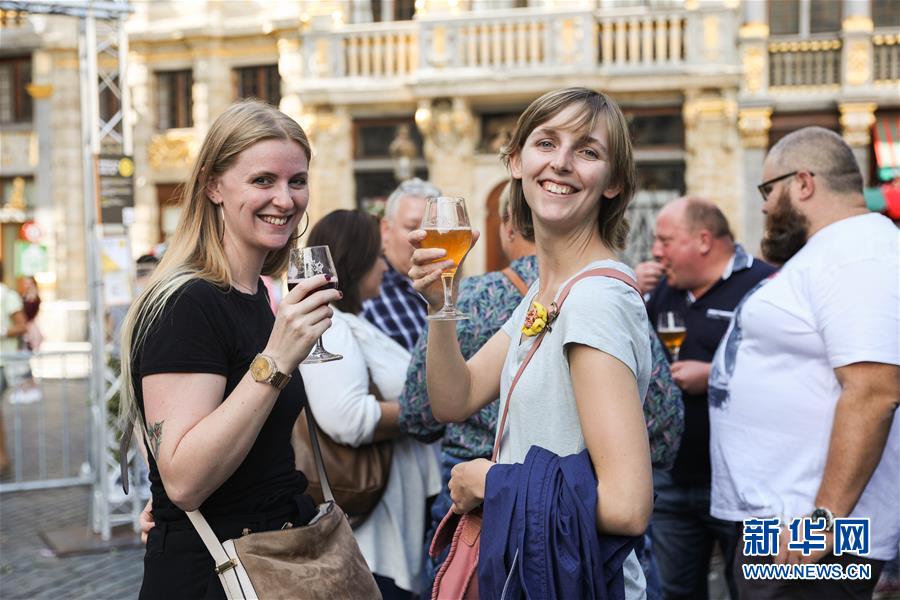 9月9日,啤酒爱好者在比利时布鲁塞尔大广场品尝啤酒。 新华社记者郑焕松摄