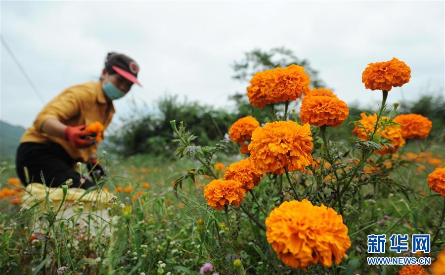 近日,贵州省赫章县兴发乡的村民忙着采摘万寿菊,供应市场。2018年,位于乌蒙山区的赫章县在部分乡村种植万寿菊1万余亩,既美化村庄,又获得经济收益,让“农旅结合”模式促进农民增收,助力乡村振兴。