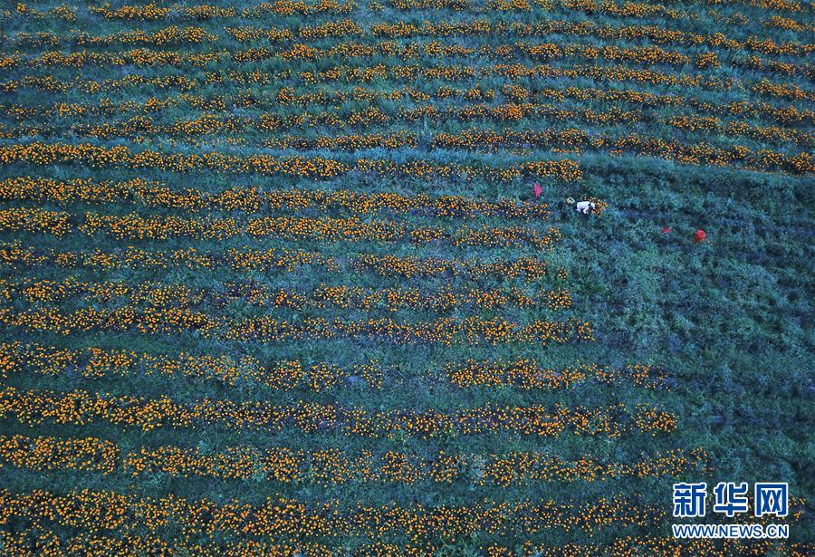 近日,贵州省赫章县兴发乡的村民忙着采摘万寿菊,供应市场。2018年,位于乌蒙山区的赫章县在部分乡村种植万寿菊1万余亩,既美化村庄,又获得经济收益,让“农旅结合”模式促进农民增收,助力乡村振兴。