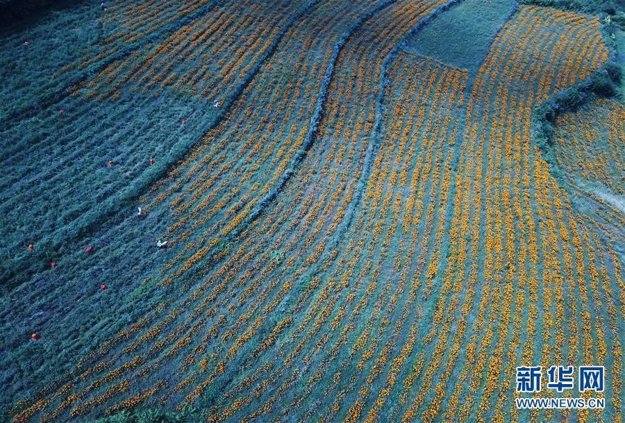 近日,贵州省赫章县兴发乡的村民忙着采摘万寿菊,供应市场。2018年,位于乌蒙山区的赫章县在部分乡村种植万寿菊1万余亩,既美化村庄,又获得经济收益,让“农旅结合”模式促进农民增收,助力乡村振兴。