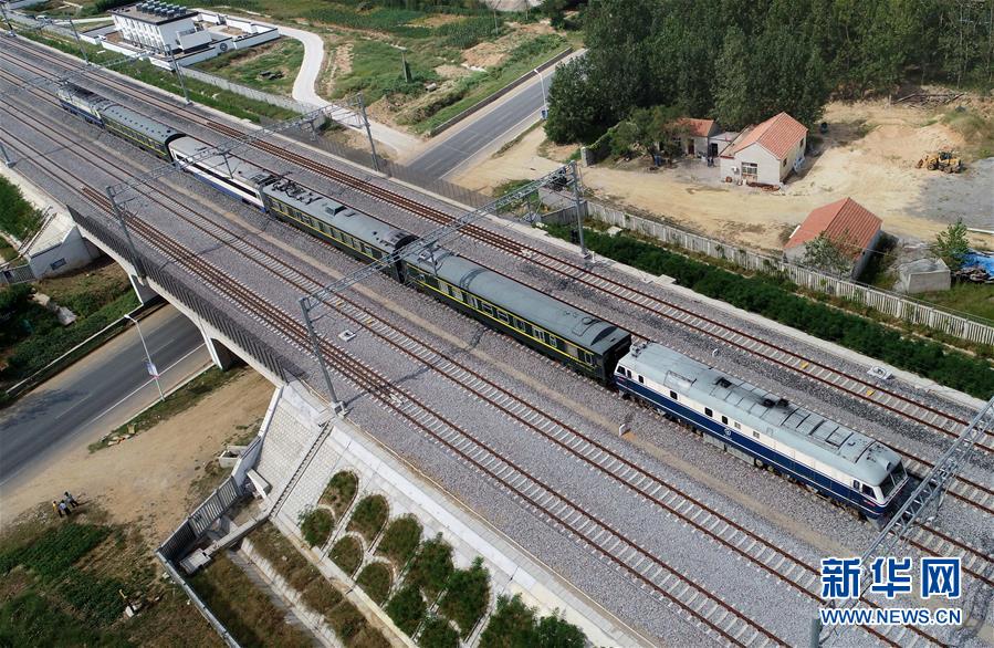 9月12日,一列检测列车即将驶入位于江苏省连云港市的赣榆北站(无人机拍摄)。新华社发(王健民 摄)