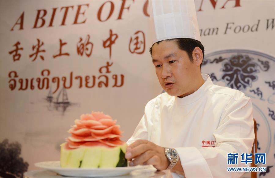 9月12日,在老挝万象,一位厨师表演“水果雕刻”。