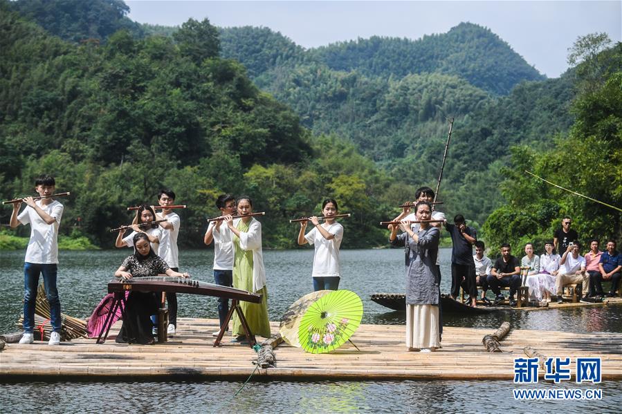 9月13日,紫荆村的演奏者在竹排上演奏竹笛。