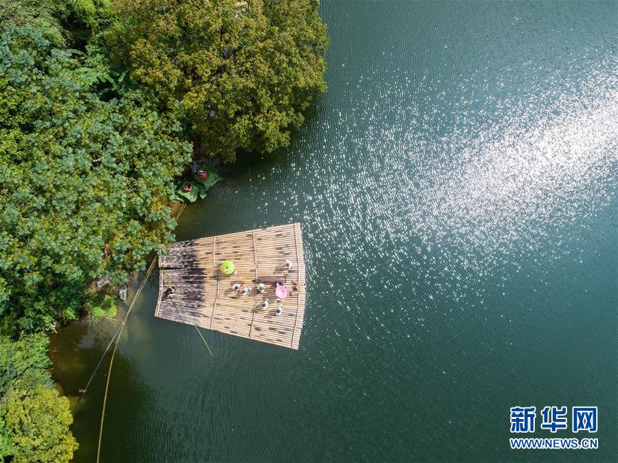 9月13日,紫荆村的演奏者在竹排上演奏竹笛(无人机拍摄)。 新华社记者 徐昱 摄