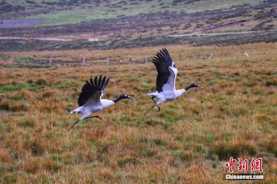 黑颈鹤在草原上结伴而飞。 安建斌 摄