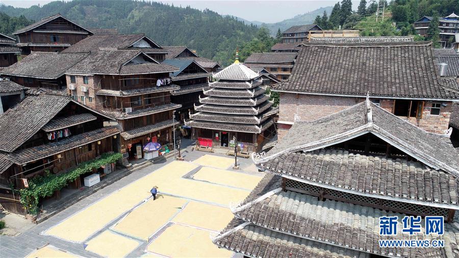 9月12日,广西三江侗族自治县林溪镇平岩村村民在晾晒稻谷(无人机拍摄)。 新华社发(龚普康 摄)
