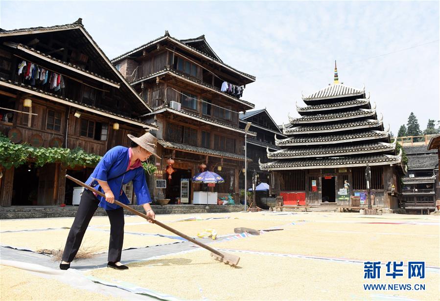 9月12日,广西三江侗族自治县林溪镇平岩村村民在晾晒稻谷。 新华社发(龚普康 摄)
