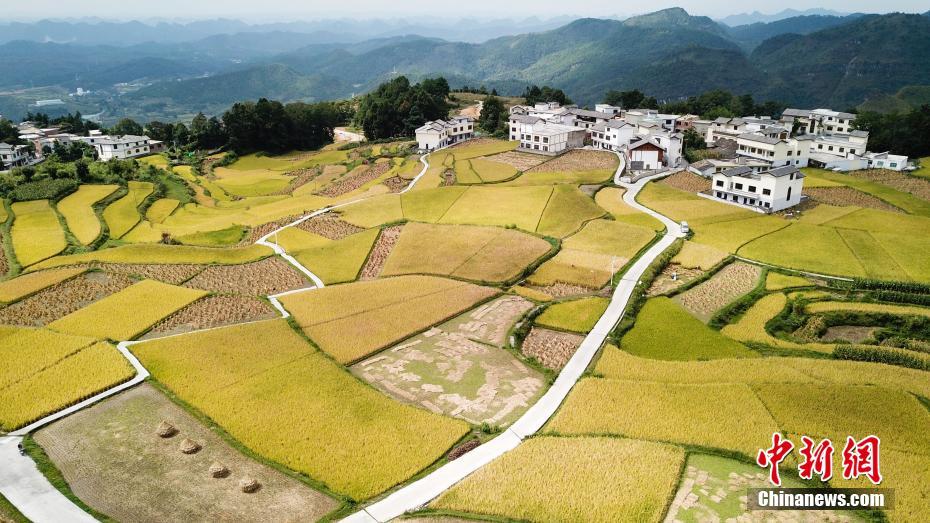 9月14日,航拍高坡乡石门村稻田秋色。金秋时节,贵州省贵阳市花溪区高坡乡的稻谷成熟,金黄色的稻田层层叠叠与房屋和乡村小道交相辉映,呈现一幅美丽的秋日画卷。 中新社记者 瞿宏伦 摄