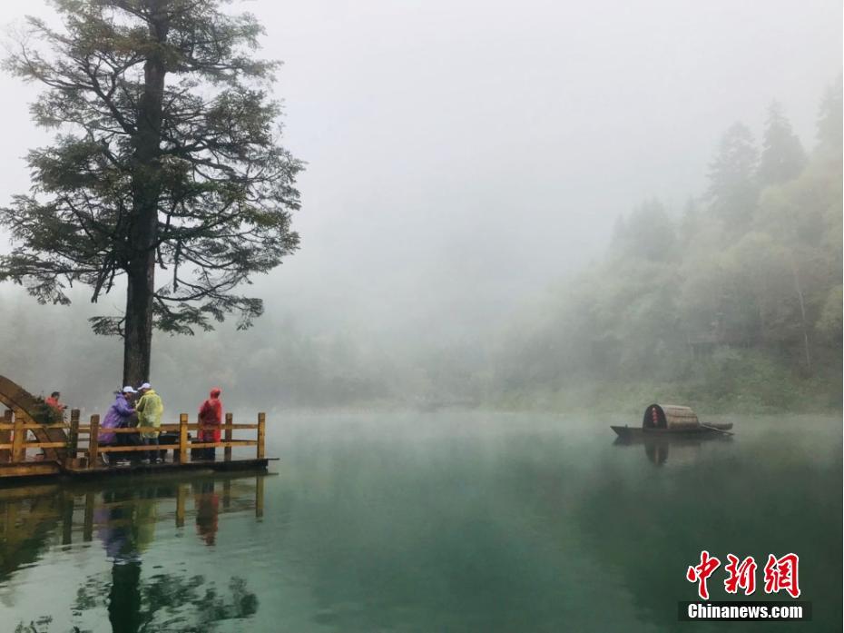 游客拍摄湖面的一叶扁舟。闫姣 摄