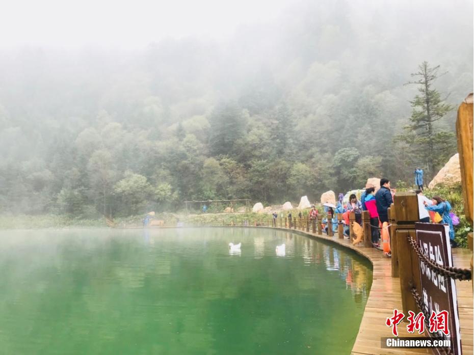 甘肃陇南市宕昌县官鹅沟景区内“天池”雾气氤氲,不少游客忆起《诗经》中经典诗句。闫姣 摄