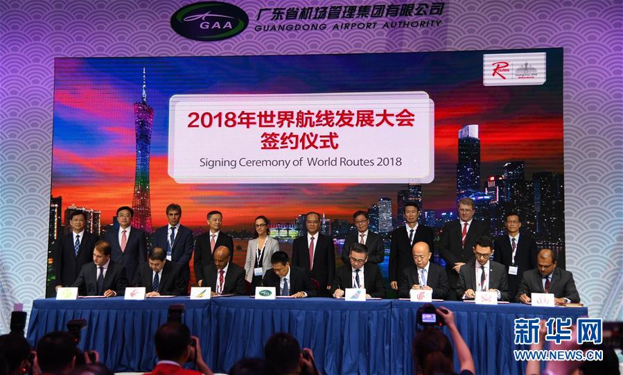 这是9月16日拍摄的世界航线发展大会签约仪式现场。 当日,2018年世界航线发展大会在广州开幕。来自全球110多个国家和地区的300多家航空公司、700多家机场管理机构与130多家政府及旅游机构参加本届大会。 新华社记者 邓华 摄