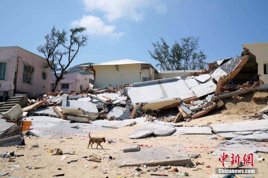 9月19日,强台风“山竹”已经过去三天,但进入香港石澳渔村的道路仍未恢复正常,大巴车依旧停驶。石澳泳滩、后滩泳滩等地满目疮痍,周星驰电影《喜剧之王》里的多个外景地被摧毁,著名的婚纱摄影景点“蓝桥”(情人桥)更是被台风引起的风暴潮彻底摧毁,荡然无存。图为《喜剧之王》中著名外景地石澳健康院临海滩一面的建筑物倒塌,而著名的“定情树”却傲立不倒。中新社记者 张炜 摄