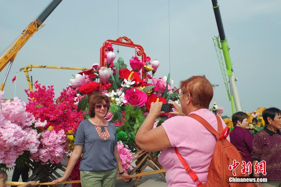 9月20日,北京天安门广场上,国庆主题庆祝花篮“祝福祖国”已经显露雏形,吸引外国游客拍照。中新社记者 贾天勇 摄