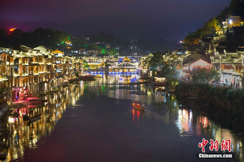 9月18日晚,游人在湖南凤凰古城体验夜游沱江。沱江两岸灯火通明,夜景如画。中新社记者 杨华峰 摄