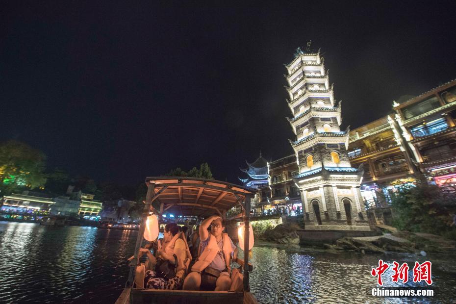 9月18日晚,游人在湖南凤凰古城体验夜游沱江。沱江两岸灯火通明,夜景如画。图为游人乘船体验沱江夜游。中新社记者 杨华峰 摄