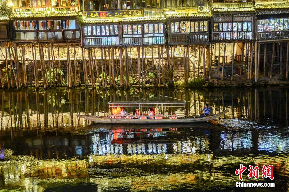 9月18日晚,游人在湖南凤凰古城体验夜游沱江。沱江两岸灯火通明,夜景如画。图为吊脚楼下的游船。中新社记者 杨华峰 摄