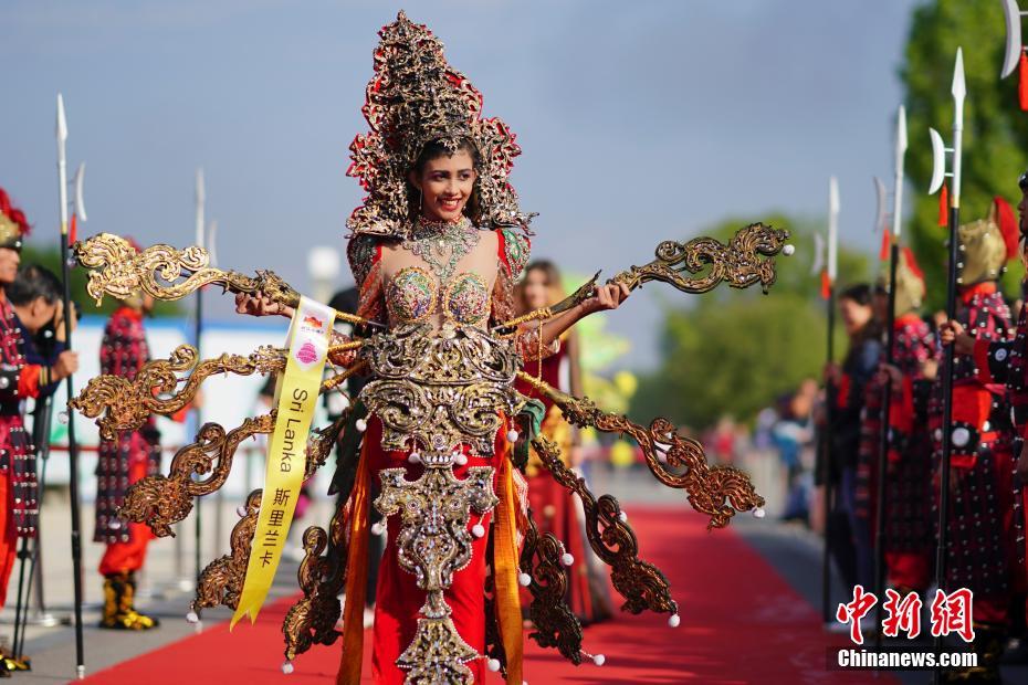 9月21日,2018世界旅游小姐全球总决赛入城仪式在汉中举行。来自美国、俄罗斯、法国、巴西、委内瑞拉等60个国家和地区的60名佳丽身着特色国服依次入城,开始了她们在汉中这座历史文化名城的首次亮相。图为斯里兰卡佳丽亮相。 中新社发 钟欣 摄