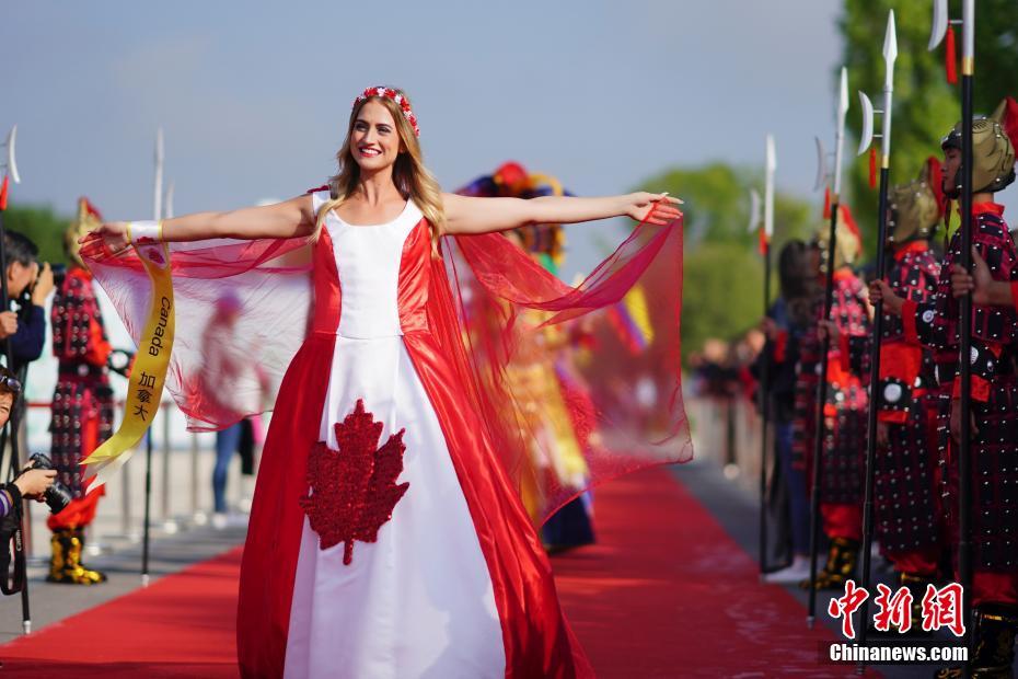 9月21日,2018世界旅游小姐全球总决赛入城仪式在汉中举行。来自美国、俄罗斯、法国、巴西、委内瑞拉等60个国家和地区的60名佳丽身着特色国服依次入城,开始了她们在汉中这座历史文化名城的首次亮相。图为加拿大佳丽亮相。 中新社发 钟欣 摄