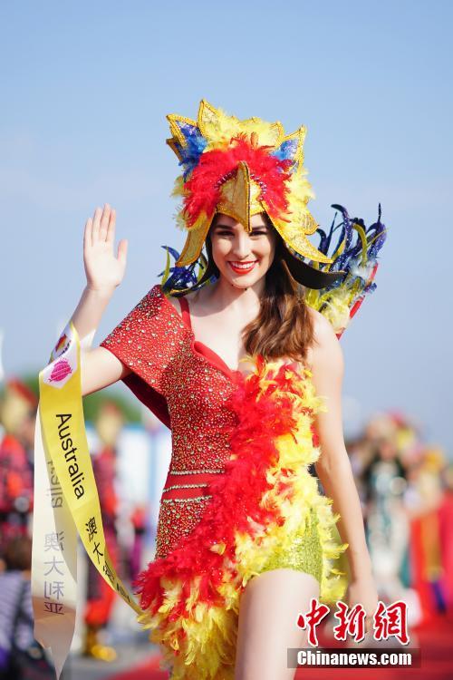 9月21日,“兴汉胜境杯”2018世界旅游小姐全球总决赛入城仪式在汉中举行。来自美国、俄罗斯、法国、巴西、委内瑞拉等60个国家和地区的60名佳丽身着特色国服依次入城,开始了她们在汉中这座历史文化名城的首次亮相。图为澳大利亚佳丽亮相。 中新社发 钟欣 摄