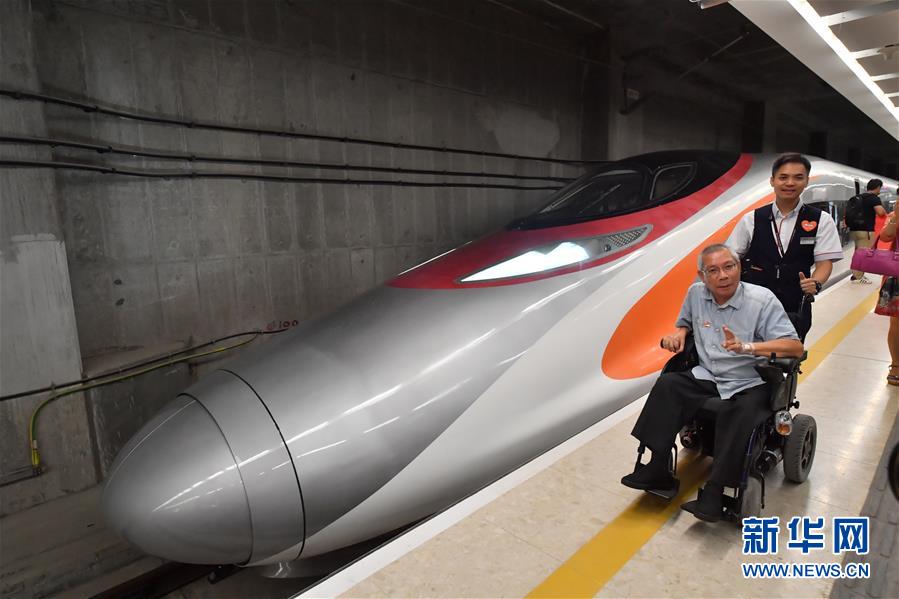 9月23日,在香港西九龙站,乘客在列车前留影。