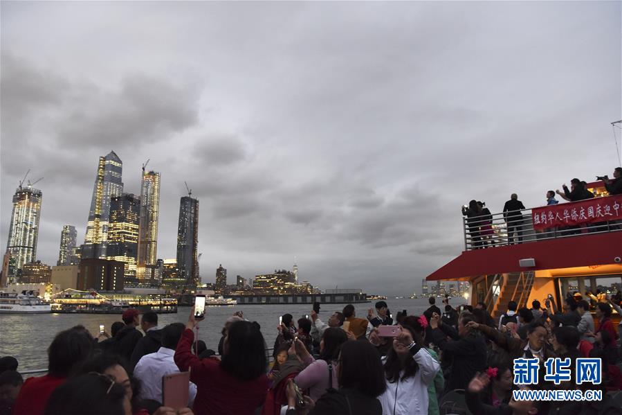 9月23日,在美国纽约,人们参加游船赏月活动。 23日晚,纽约华人社团联合总会等20多个侨团联合主办哈得孙河游船赏月活动。游船从哈得孙河到东河,途经炮台公园、自由女神像、华尔街金融区、联合国大楼等著名景点。 新华社记者韩芳摄