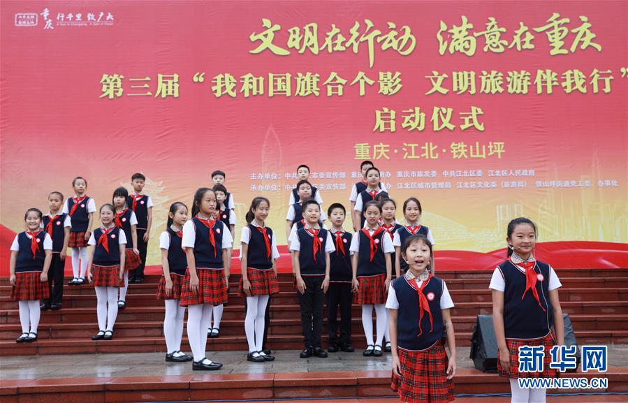 9月25日,学生代表在主题活动启动仪式上朗诵。 当日,为加强爱国主义教育,倡导文明旅游,重庆市江北区在江北铁山坪森林公园举办“我和国旗合个影 文明旅游伴我行”主题活动。 新华社记者 王全超 摄