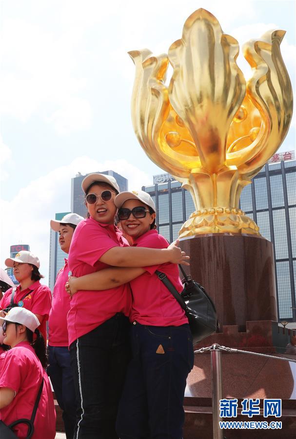 9月25日,游客在香港金紫荆广场留影。当日,许多游客来到香港金紫荆广场参观游玩。新华社记者 吴晓初 摄