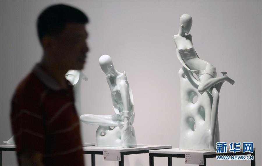 9月25日在双年展上拍摄的陶艺作品《观月》。 当日,“泥土之相——2018杭州国际当代陶艺双年展暨第十一届中国当代青年陶艺家作品双年展”在位于杭州的中国美术学院美术馆开幕。展览展出来自国内外的38名艺术家的400余件作品。 新华社发(施健学 摄)