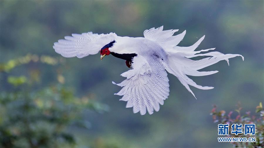 9月26日,一只白鹇在南靖县鹅仙洞自然保护区飞翔。 新华社记者 梅永存 摄