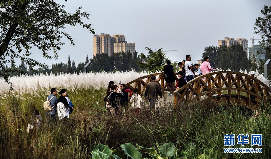 9月28日,人们在芦花盛开的汉江湿地公园里游览。新华社记者陶明 摄