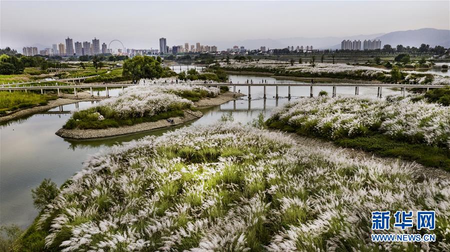 9月28日,人们在汉中市汉江湿地公园游览(无人机拍摄)。新华社记者陶明 摄