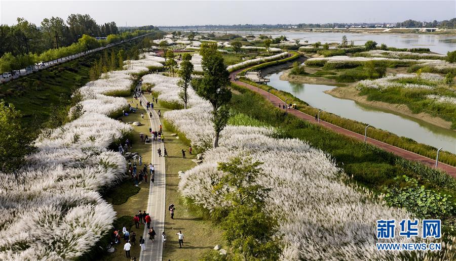 9月28日,市民在汉中市汉江湿地公园游览(无人机拍摄)。新华社记者陶明 摄