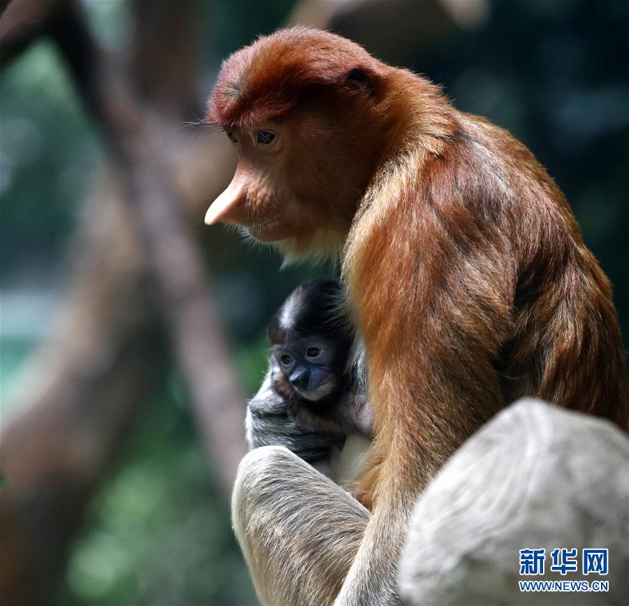 9月28日,大鼻猴宝宝与妈妈在一起玩耍。新华社记者 黄国保 摄