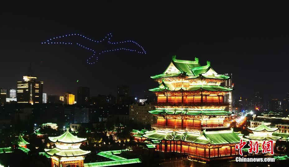 图为无人机组成的“孤鹜”动态图形在滕王阁上空飞舞。翼眸 摄