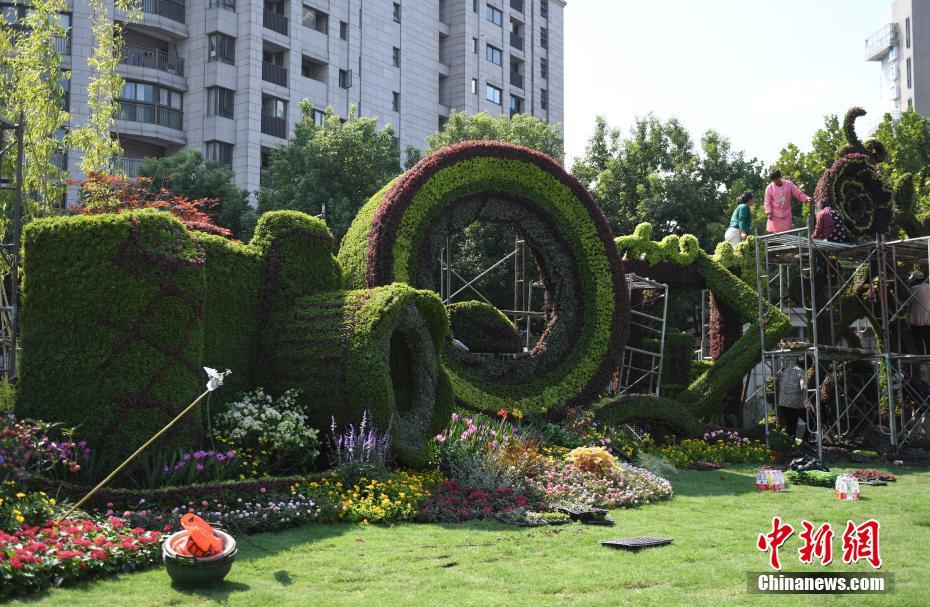 9月29日,一大型绿植景观正在搭建中。在国庆节即将到来之际,浙江杭州街头已开始搭建绿植景观,来扮靓城市颜值。中新社记者 王刚 摄