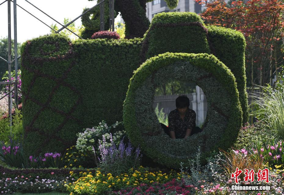 9月29日,一名工作人员正在妆点绿植“相机”。在国庆节即将到来之际,浙江杭州街头已开始搭建绿植景观,来扮靓城市颜值。中新社记者 王刚 摄