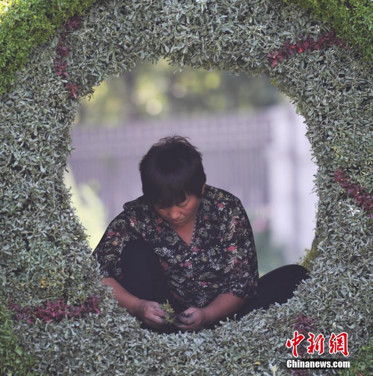 9月29日,一名工作人员正在填充绿植所需的植物。在国庆节即将到来之际,浙江杭州街头已开始搭建绿植景观,来扮靓城市颜值。中新社记者 王刚 摄