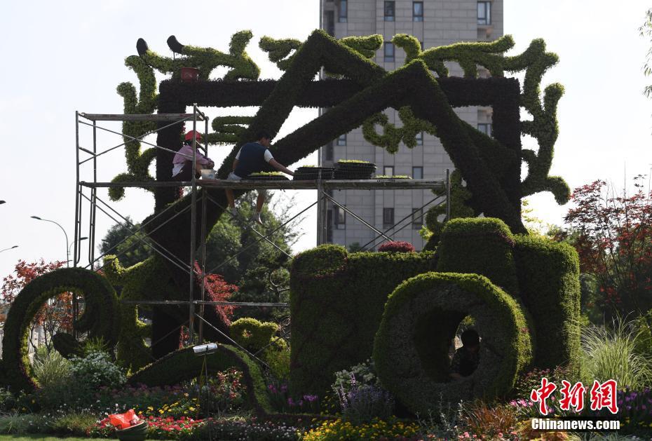 9月29日,两名工作人员正在装扮大型的街头绿植。在国庆节即将到来之际,浙江杭州街头已开始搭建绿植景观,来扮靓城市颜值。中新社记者 王刚 摄