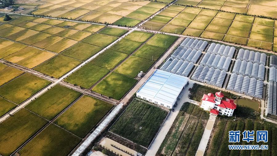 这是北大荒集团在小岗村建立的现代化水稻生产基地(9月27日无人机拍摄)。 新华社记者 张端摄