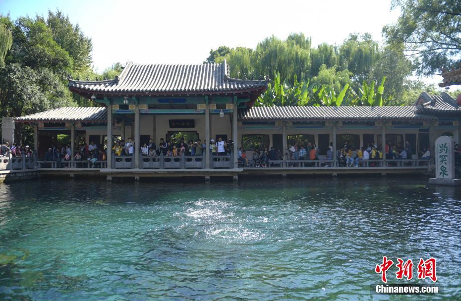 10月1日,游客在济南趵突泉公园观赏“天下第一泉”。国庆假期首日,济南趵突泉公园游人如织,游客观泉赏秋,享受乐趣。中新社记者 张勇 摄