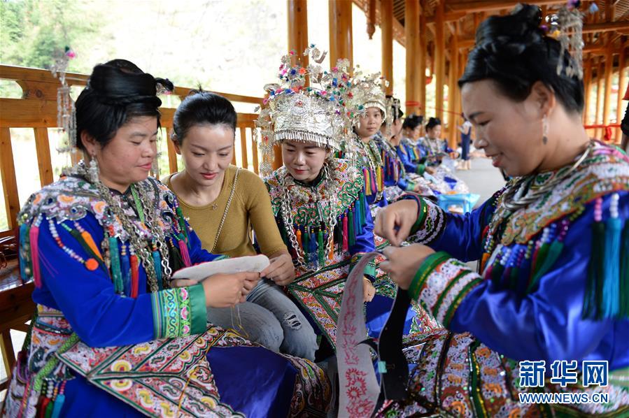 10月2日,在贵州省黔东南苗族侗族自治州榕江县寨蒿镇乌公侗寨,侗族妇女在向游客介绍编织、刺绣技艺。 新华社记者 杨楹 摄