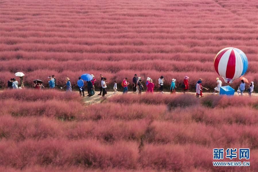 国庆假期,江苏南京溧水区郭兴庄园种植的景观植物粉黛乱子草进入盛花期,成片的“粉红田野”吸引了众多游客。