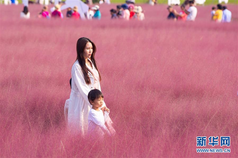10月3日,游客在“粉红田野”中游玩。 新华社发(苏阳 摄)