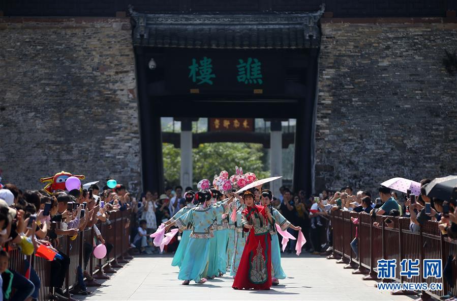 10月2日,游客在安徽省黄山市歙县徽州古城内观看古装巡演。 新华社发(施亚磊 摄)