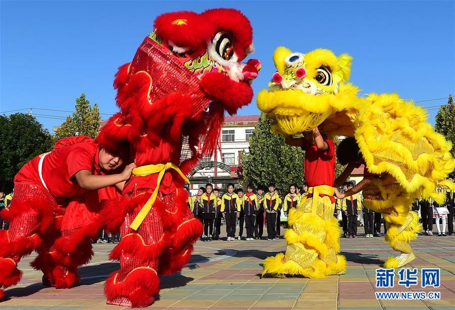 10月3日,河北省沧州市盐山县实验小学学生在青少年民俗展演活动中表演舞狮。 新华社发(傅新春 摄)