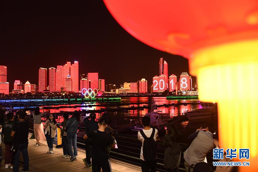 游客在青岛奥帆中心观看灯光秀表演(10月3日摄)。